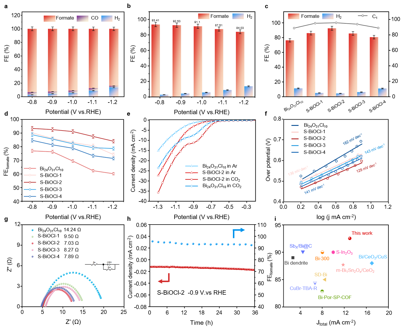 在-0.8至-1.2 V (vs. RHE)的宽电位范围内,S-BiOCl始终保持80%以上的甲酸法拉第效率(FEformate),其最大值可达92.53%(C1产物选择性达95.07%)。