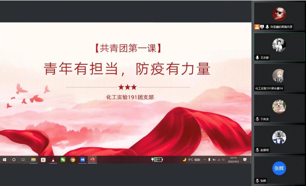 4月2日,化工实验191团支部开展线上主题宣讲,团支书通过ppt的方式,向大家宣传近期国内、山东省以及青岛市疫情动向和变化,详细介绍公司应对防疫所采取的相关措施,要求大家严格遵守学校疫情防控要求,积极科学应对疫情,做到不信谣、不传谣,弘扬积极主旋律。随后,班内三个同学们分享了疫情防控志愿者的经历,向大家分享了感受和收获,号召同学积极投身志愿活动,展现科大青年的担当与作为。
