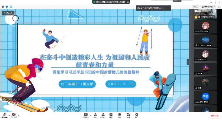 在奋斗中创造精彩人生,为祖国和人民贡献青春力量。为响应学校团委号召,化工实验211班于3月20日开展“贯彻学习习近平总书记给中国冰雪健儿的回信精神”网上主题团课。