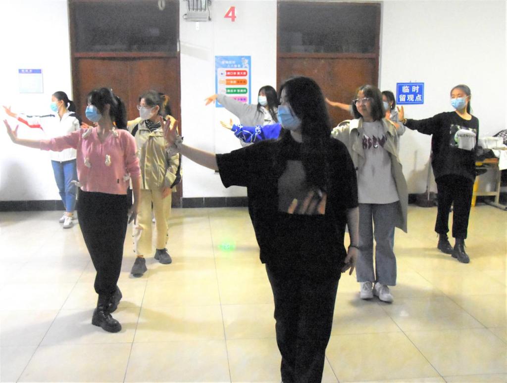 本次排舞的曲目为《美丽中国我的家》,舞蹈为圆舞曲风格,舞步简洁大方,易学易记。歌曲主题鲜明,具有积极向上的正能量,表达了同学们对伟大祖国的深厚感情。在排练过程中,首先,由领舞成员给大家进行舞蹈分解动作的讲解,同学们认真倾听,并跟随着领舞数的节奏八拍进行一次次的练习。接下来,同学们对舞蹈动作进行跟音乐练习,在一遍遍的反复练习后,同学们的动作也从开始的参差不齐变得整齐有序。最后,在领舞的带领下,同学们对所学过的舞蹈动作进行了整合练习,舞步优美,训练效果显著。排练结束后,同学们纷纷表示,排舞过程虽累,但很开心,在这几天的训练过程中,结识了很多兴趣爱好相同的朋友,也学到了很多舞蹈知识,一整天学习的疲惫在训练过程中得到了很好的缓解。