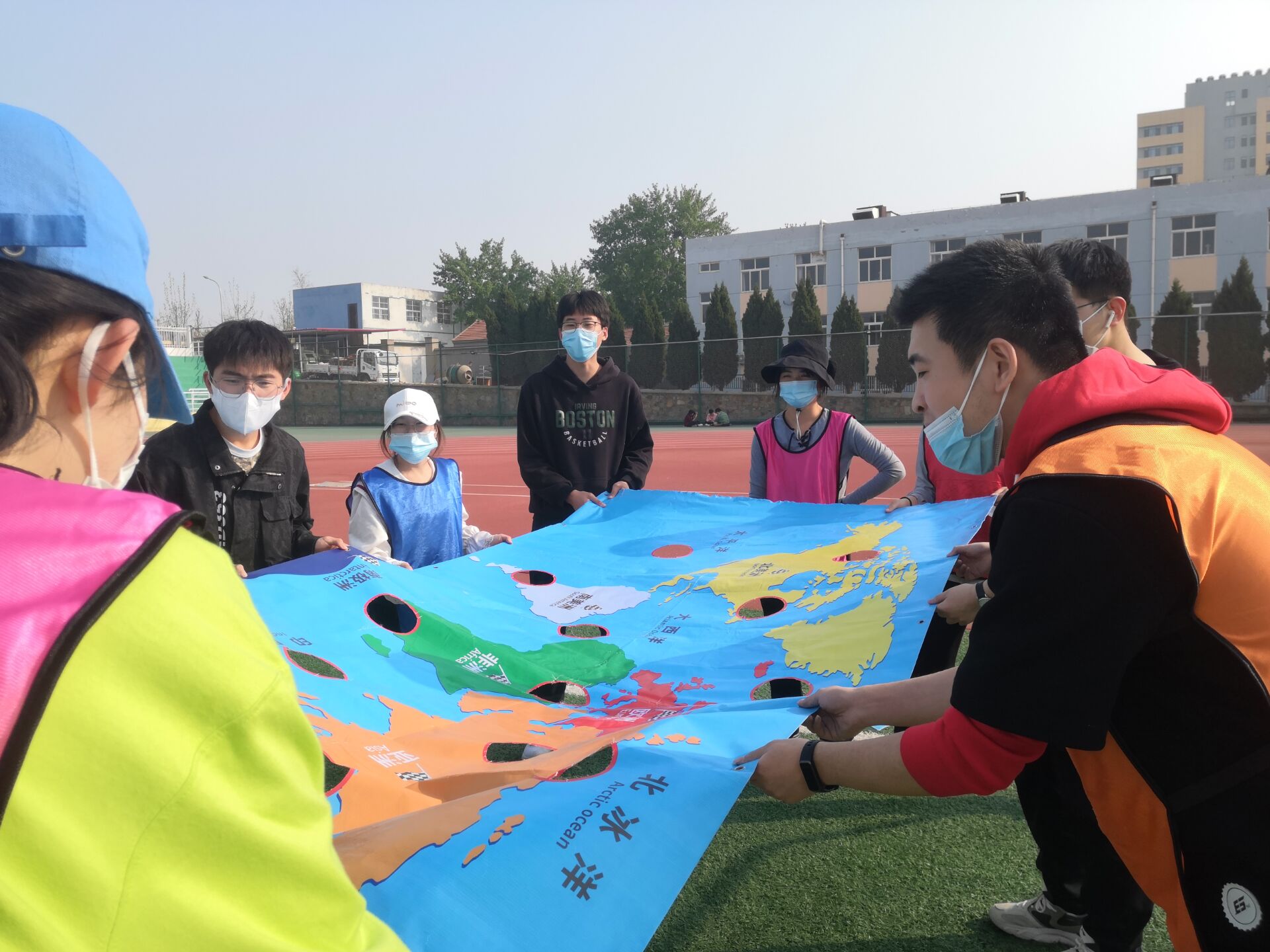 本次活动分为团体赛,环游世界杯、珠行万里、巨人足、不倒森林和两人三足。个人赛,摸石头过河。其中,最受同学喜欢的项目是环游世界杯。游戏要求,所有成员必须双手拉住世界球地图的边缘,手不得接触高尔夫球,高尔夫球在运行中如出现掉落的情况,则需返回起点重新挑战。高尔夫球的运行路线必须穿过世界球地图上的七大洲四大洋,按照规定路线到达指定的终点洞中掉落,即项目挑战成功。在同学们的互相默契的配合下,圆满完成了此次团体辅导活动。