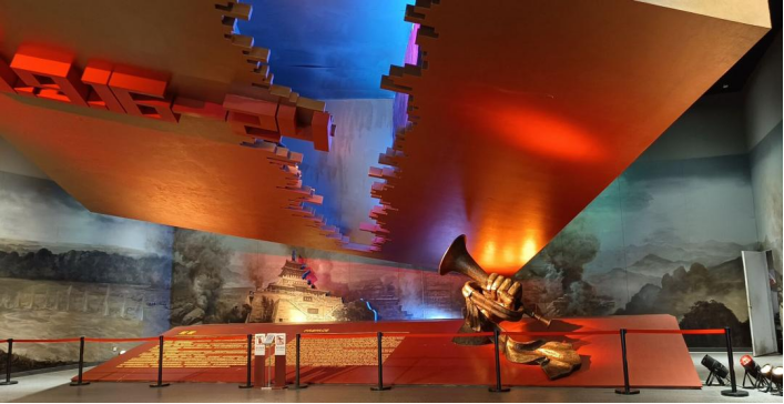 7月10日下午团队成员怀着激动地心情到达济南战役纪念馆。在讲解人员的口中,成员们了解到,作为全国爱国主义教育示范基地的济南战役纪念馆收录了解放战争时期战士们的遗留器物,展示了中国人民解放军保家卫国的那段红色历史。首先团队成员们来到纪念馆一楼的大厅,印象最为深刻的是那一尊方形雕塑,雕塑下面是一只紧握冲锋号角的手,其奔涌出的红色曙光,吹响了解放战争的号角,仿佛有一股红色的力量在冲锋号的带领下拼尽全力逆转了当时不可改变的局势。同时,它身后的壁画展示了战场上恶劣的条件,折射出战士们不畏艰险、不怕牺牲的精神。成员们在看到的种种生死较量里,感受到了先辈们“力拔山兮气盖世”的英雄本色。