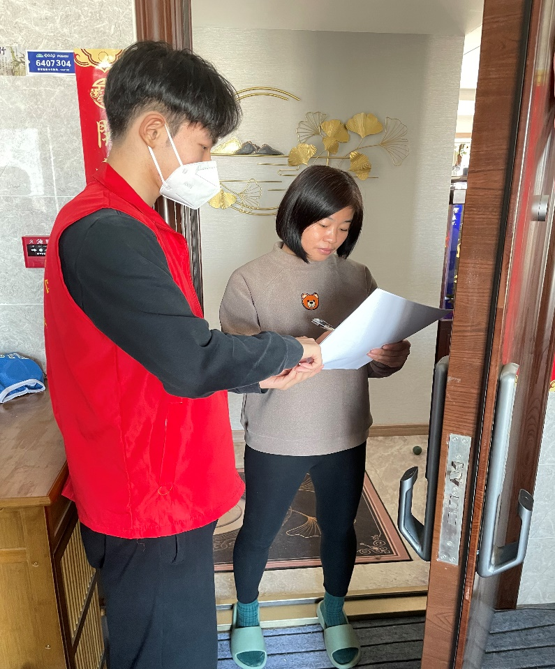 为维护社区和谐稳定,保障社区工作平稳推进,1月9日至10日,侯博文加入社区志愿者团队与社区居委会一道在当地社区走访,发放调查问卷,及时收集民意并耐心与当地居民沟通、记录他们遇到的问题及时向居委会反映,以便落实解决。经过两天走访,志愿者团队总计发放调查问卷500余份,汇集问题26个。