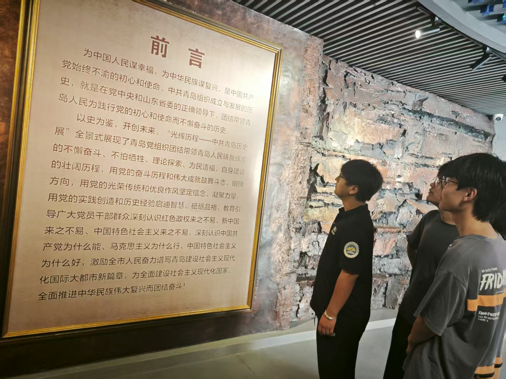 在专题展厅,大家全面了解了青岛党组织创建的光辉历程,深刻感受到青岛共产党人坚守理想信念、践行初心使命的崇高精神。无论是早期党组织领导的工人运动,还是在艰难岁月里为民族独立和人民解放所做出的不懈努力,都让队员们深受触动。参观过程中,团队成员们积极互动,分享自己的感受和见解。有的同学感慨道:“这些历史资料让我真切地感受到,今天的幸福生活来之不易,是无数革命先烈用鲜血和生命换来的。”还有同学表示:“作为新时代的青年,我们肩负着实现中华民族伟大复兴的历史使命,一定要从党史中汲取力量,坚定信念,努力奋斗。”