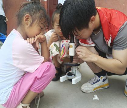 “这个‘小眼睛’能看到什么?”支教成员手持显微镜的提问,拉开了微观世界探索课的序幕。他通过自制PPT与实物演示,层层递进讲解显微镜原理,将晦涩的光学知识转化为生动互动。实践环节中,孩子们专注地调整焦距、放置洋葱内表皮样本,当排列整齐的细胞在视野中清晰显现时,惊喜的“哇”声此起彼伏,小伙伴们纷纷围拢共享发现的喜悦。