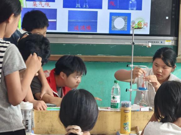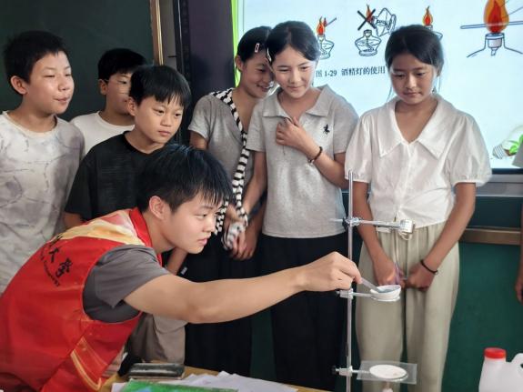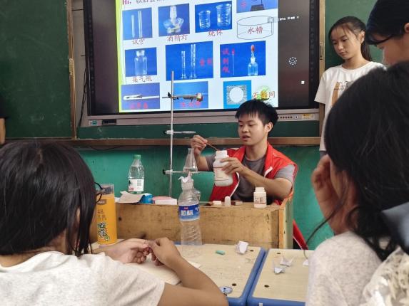 支教团依托化学工程与工艺专业优势,将实验室搬进乡村课堂。课堂伊始,“碳酸钠溶解”实验视频中,透明颗粒在水中逐渐“消失”的画面,配合志愿者“就像糖和水交朋友”的通俗讲解,瞬间拉近了孩子们与化学的距离。实操环节里,蓝色硫酸铜晶体入水后让液体幻化成“大海的颜色”,酸碱中和时“咕噜”冒泡的奇妙反应,引发阵阵欢呼。
