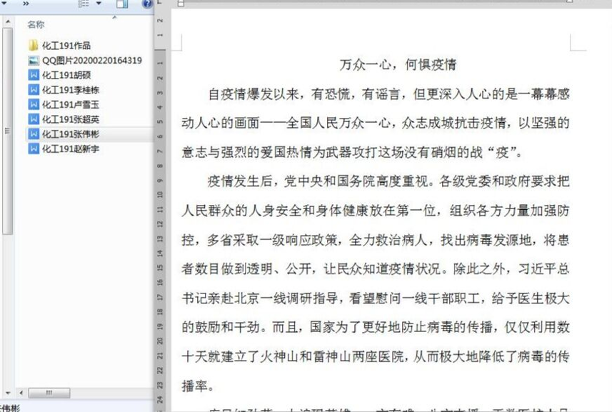 在2019年的年底,一种新型冠状病毒在湖北武汉爆发,因为极强的传染性和致病率,再加上春运导致的人员流动,导致病毒以武汉为中心全面爆发开来。在此背景下,化工191班首先在QQ群里发布征文比赛的通知。同学们自愿报名参加,不参加的同学自动作为评委。3月6日18:00完成成绩的核算并公示,最终评选出优秀征文在班内展示,供大家学习。