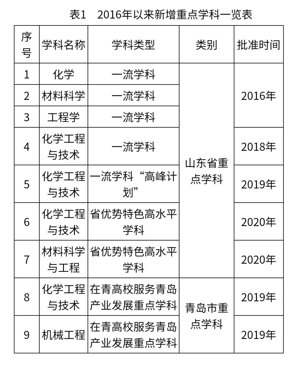 2016年化学、材料科学、工程学3个学科入选山东省重点建设“一流学科”行列;2018年化学工程与技术入选省一流学科,并于2019年入选省一流学科“高峰计划”A类学科;2020年化学工程与技术、材料科学与工程2个学科入选山东省“优势特色”类高水平学科,学校入选山东省“强特色”类高水平大学;2019年化学工程与技术、机械工程入选在青高校服务青岛产业发展重点学科(表1)。目前公司US News世界学科排名上榜7个学科,化学工程与技术位列第102位。在全国第四轮学科评估中,学校有9个学科进入前70%,其中化学工程与技术为B+,省属高校工科唯一(表2)。
