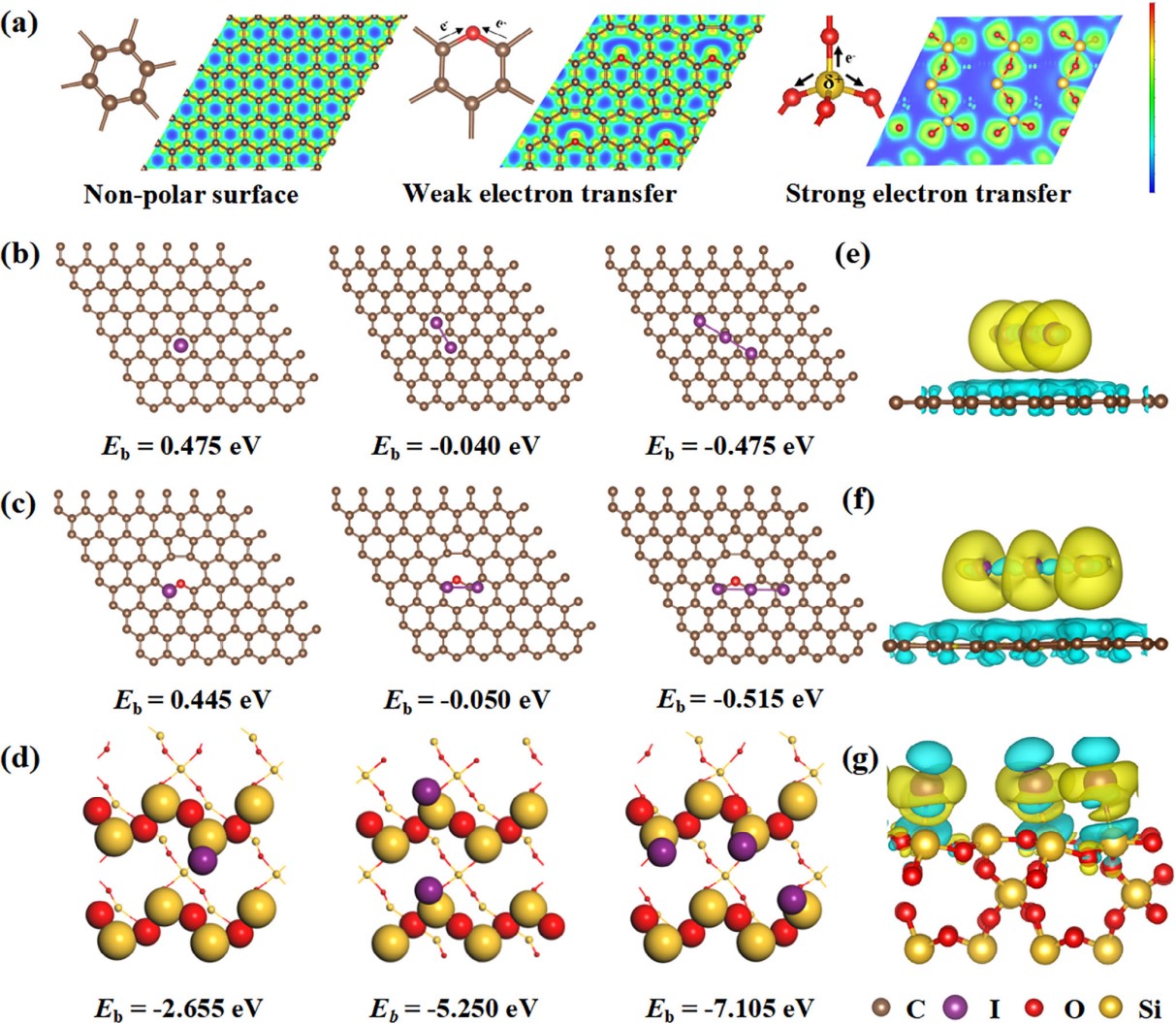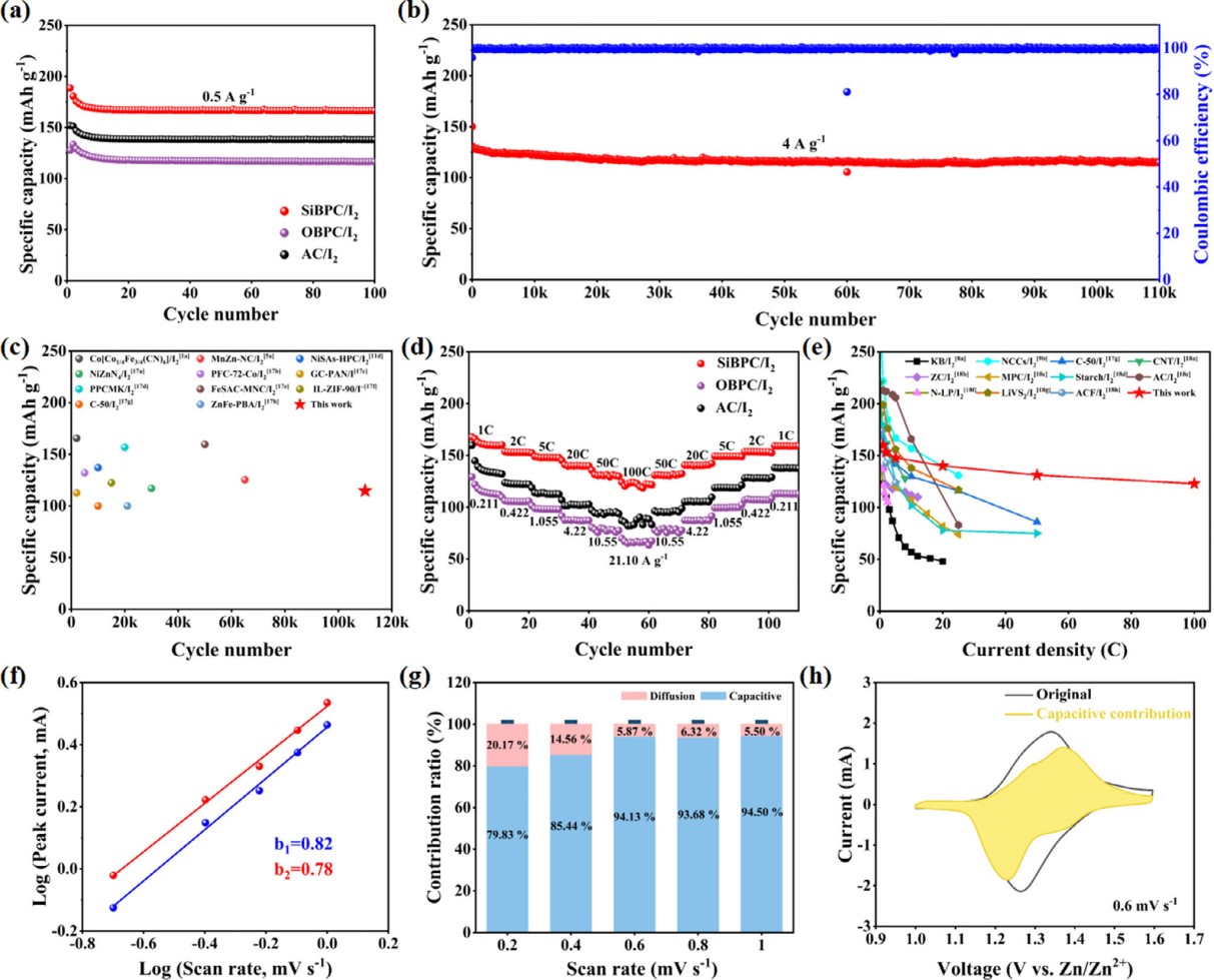 水系锌碘电池因其本征安全、资源丰富、环境友好等优点在大规模储能领域展现出广阔的应用前景。但对于碘正极,多碘化物严重的穿梭效应和缓慢的转化反应动力学导致其电化学性能无法满足实际应用的需求。针对以上问题,该研究提出了一种新型碳基宿主材料改性策略,即通过引入Si亲电中心有效地化学锚定富电子的多碘化物。首先,该研究团队通过密度泛函理论(DFT)计算筛选了三种构型(C-C、C-O、Si-O),发现Si-O键与多碘化物间的吸附能较强。由于Si的电负性(1.90)远低于O(3.44),Si原子周围的电子被相邻O原子吸引,从而形成了Si亲电中心。此外,吸附在Si-O键上的多碘化物(I3-)展现出较小的HOMO-LUMO能隙,从而在动力学上促进了其转化。该研究团队利用系列谱学技术和电化学测量方法验证了该设计策略。基于该策略,该研究团队以生物质杨树花为原材料制备出双功能SiBPC亲电宿主材料,其结构为SiO2纳米晶镶嵌在微孔碳中。基于SiBPC宿主材料的碘正极展现出优异的循环稳定性(110000次)和倍率性能(100 C)。当碘负载量达到36.5 mg cm-2时,基于SiBPC宿主材料的碘正极仍然能够在100次循环后保持127.6 mAh g-1的比容量。该研究为高性能碘正极宿主材料的开发提供了一条合理可行且可持续的路线。
